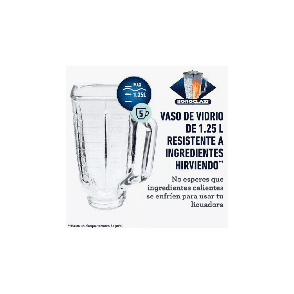Su motor duradero y potente de 700 watts te asegurará una preparación más fácil, mientras que la cuchilla, capaz de triturar hielo y alimentos duros, te permitirá preparar licuados perfectos. Por otro lado, su jarra de vidrio resistente a choques térmicos posee una capacidad de 1,25 litros.